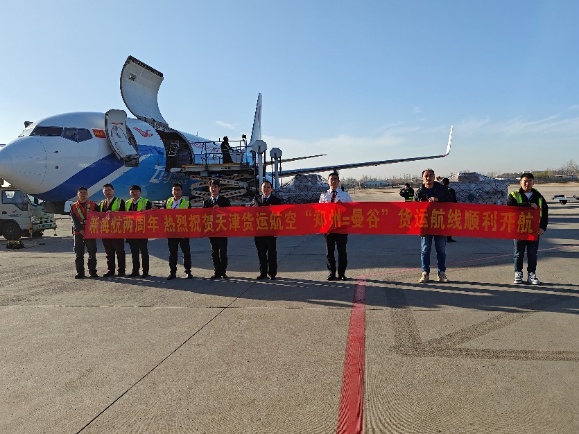 天津货运航空于12月8日上午,执飞B737全货机,满载日化用品、电商货物从郑州新郑国际机场起飞,空运到曼谷素万那普机场,期间飞行里程约为3000多公里,空中飞行时间约为4小时到达,这标志着天津货运航空郑州=曼谷国际货运航线正式开通。